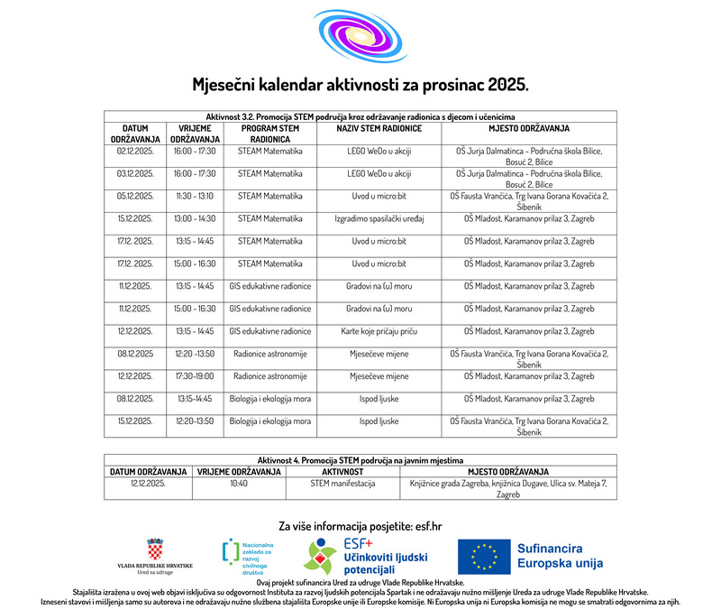 U prilogu možete pogledati Mjesečni kalendar aktivnosti za prosinac 2025. godine u sklopu ESF+